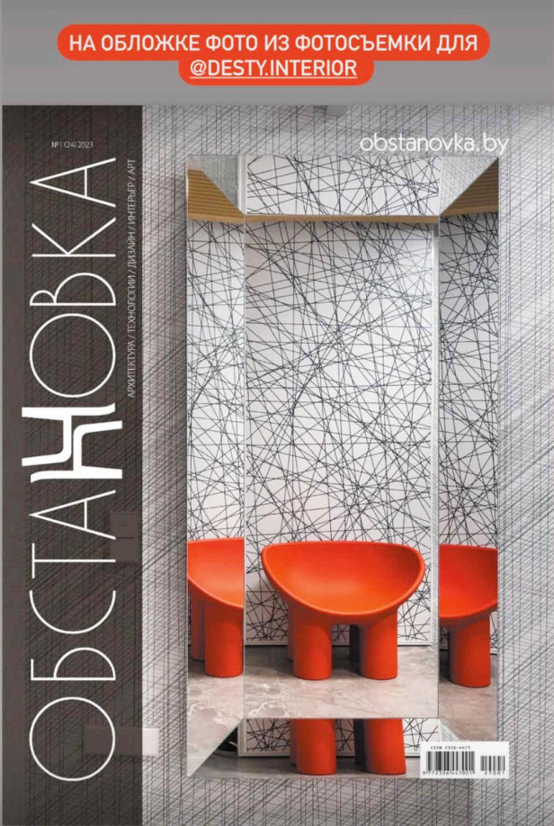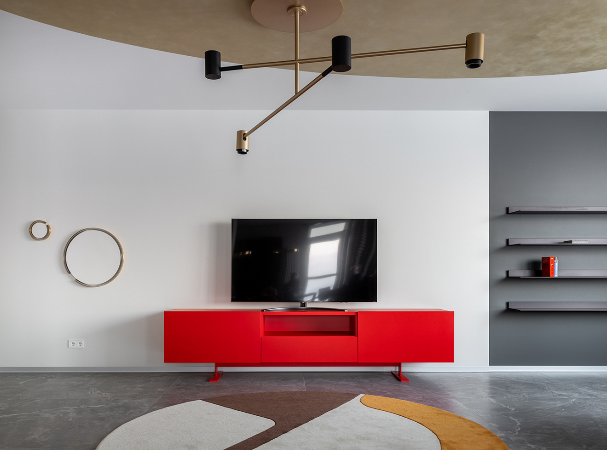 Из практических соображений было решено облицевать стены плиткой. Хотелось уйти от банальности, поэтому отказались от мраморно-гранитных фактур. Выбор пал на плитку с более жилой и тактильной фактурой. Именно ее рисунок стал основой оригинальной концепции всего проекта. Цветовые акценты помещений отлично смотрятся на ее фоне и превращают квартиру в арт-пространство, наполненное объектами современного искусства. Ими можно считать мебель насыщенного красного цвета, авторскую плитку на рабочей поверхности кухни, светильник на потолке гостиной.